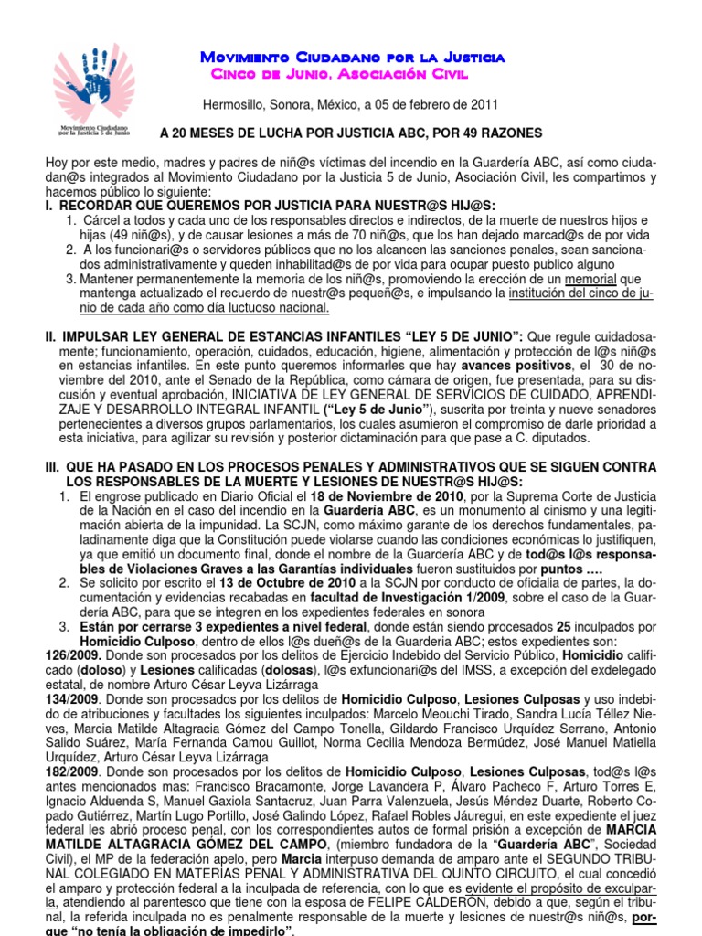 Movimiento ciudadano manifiesta su profunda indignación y coraje por el aberrante y brutal asesinato de rené tovar tovar, candidato a la alcaldía de cazones de herrera. Padres integrantes del movimiento 5 de junio, recordaron con una misa a los 49 niños y niñas fallecidos por el incendio en la guardería abc, en convocados en la iglesia san josé, el sacerdote claudio murrieta, comenzó la ceremonia católica recordando el legítimo llamado de justicia por los. Sábado, 5 de junio de 2021. Breve documental que narra los hechos sucedidos el 5 de junio de 2009 en hermosillo, sonora incendio de la guardería abc y surgimiento del movimiento ciudadano por la justicia 5 de junio. Nosotros sabemos que están preparados para luchar hasta el final.